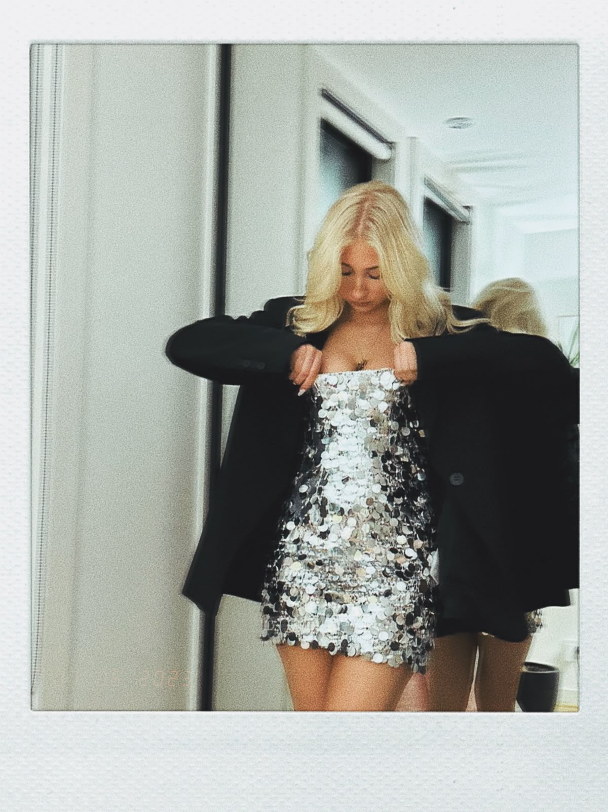 Deslumbra en cualquier ocasión con este espectacular vestido corto strapless cubierto de lentejuelas plateadas. Su diseño ajustado realza tu figura mientras refleja la luz con cada movimiento, creando un efecto brillante y glamuroso. Ideal para fiestas, eventos de noche o celebraciones especiales.
